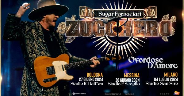 Dopo aver incantato oltre 1 milione di spettatori con il suo ultimo tour in Italia e in tutto il mondo e con i due straordinari concerti alla RCF Arena (Campovolo) di Reggio Emilia di fronte a 60 mila spettatori, ZUCCHERO "SUGAR" FORNACIARI si prepara a tornare nel 2024 con tutta la sua energia e la sua straordinaria band negli stadi italiani con "Overdose D'Amore World Tour":