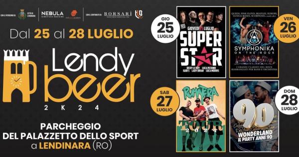 Lendybeer, il festival di birra, musica e street food torna a Lendinara, nel piazzale Carlo Alberto Dalla Chiesa, dal 25 al 28 luglio. Quattro giorni di divertimento promossi dall'associazione locale Lendybeer, con un ricco programma musicale: si inizia giovedì 25 luglio con Superstar dj, serata techno con i cinque dj più rappresentativi: Ricky Le Roy, Luca Pechino, Igor S, Lady Brian e Luca Morris. Si prosegue venerdì 26 con la seconda edizione della “Lendyrun”, corsa non competitiva di 6 chilometri lungo l’Adigetto e con “Simphonika”, un grande show che propone i classici del rock riarrangiati con un’orchestra di 25 elementi che eseguiranno brani leggendari di Queen, Pink Floyd, Europe, Beatles, Scorpions, Deep Purple, Led Zeppelin, Guns & Roses, Rolling Stones.