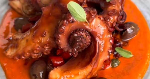 Sul fondo del piatto qualche cucchiaiata di crema di peperoni, poi i peperoni saltati e sopra in bell’ordine il polipo con i tentacoli ben disposti.